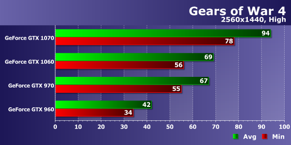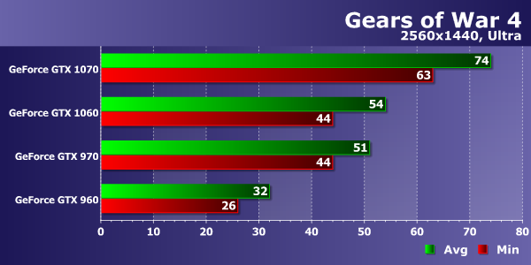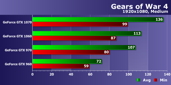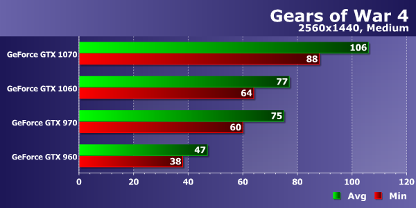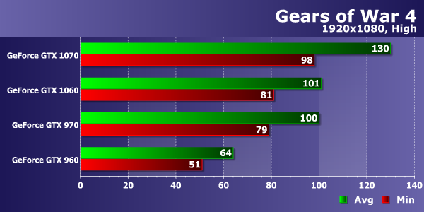 Из системных требований понятно, что игра предъявляет немалые требования к мощности как GPU, так и CPU. По результатам разных GPU видно, что скорость рендеринга не была полностью ограничена производительностью центрального процессора даже в самом простом режиме, и видеокарты в целом смогли раскрыть свои возможности. Даже младшая модель нашего сравнения (GeForce GTX 960) в условиях средних графических настроек и самого распространенного разрешения смогла справиться с обеспечением плавной частоты кадров в Gears of War 4. Средняя частота кадров была сильно выше минимальной планки в 45 FPS и даже минимальное значение оказалось почти равно 60 FPS.