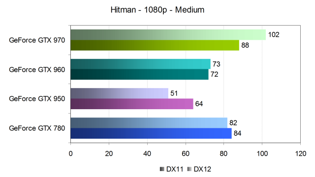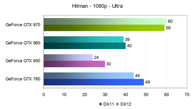 Остальные видеокарты Gigabyte обеспечивают необходимую производительность, хотя GeForce GTX 960 с ее 40 FPS в среднем снова находится на грани играбельности и требовательным игрокам придется снижать некоторые из графических настроек. А вот старшая модель нашего сравнения, GeForce GTX 970, показала 60 FPS в среднем, что более чем комфортно. Положительной разницы между DirectX 11 и 12 не отмечено — явно требуется продолжение работы над оптимизацией игры и драйверов Nvidia, ведь чаще всего при переходе к более новой версии графического API в Hitman мы видим даже потери в частоте кадров.
