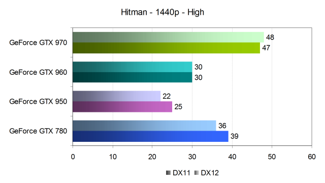 Так что нам остается лишь заметить, что владельцам видеокарт GeForce в таких условиях придется снижать качество графики на всех решениях, кроме старшего из рассмотренных нами. Лишь GeForce GTX 970 при максимальных настройках в WQHD-разрешении смогла показать частоту кадров выше 40 FPS в среднем, причем разницы между версиями DirectX в используемых рендерерах игры Hitman все так же не видно.