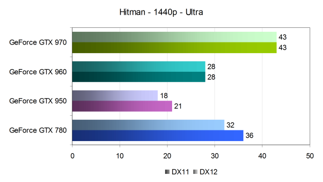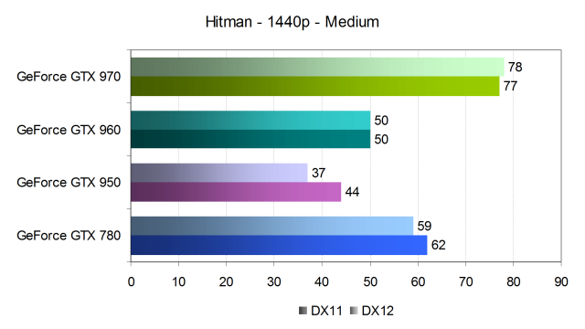 Остальные видеокарты из сегодняшнего сравнения со средними настройками в WQHD-разрешении справились легко, все они дают более чем 50 FPS в среднем при 30-40 FPS минимальных. Что же касается разницы между DX11 и DX12-вариантами игры, то новая версия графического API уже не дала прироста в скорости даже на GeForce GTX 970, не говоря уже об остальных решениях. GeForce GTX 950 привычно потеряла несколько кадров в секунду, да и GTX 780 из предыдущего поколения несколько подрастеряла свою скорость в DX12-режиме.