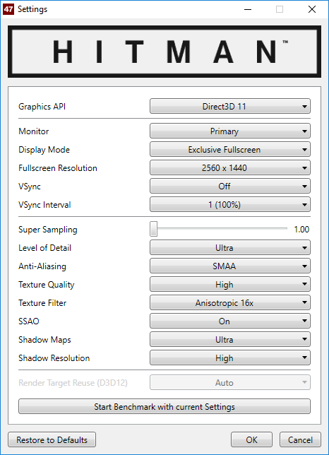 Общий вывод после нашего исследования немногочисленных графических настроек в Hitman будет таким — для достижения требуемой игровой производительности, поставьте сначала настройки на уровень High и запустите бенчмарк в нужном вам разрешении рендеринга, чтобы понять, в какую сторону нужно регулировать параметры дальше. Если скорости мало, то первым делом можно понижать такие настройки, как настройки теней — они дадут очень большой прирост скорости при их понижении. Затем можно снизить уровень детализации и отключить SSAO, если скорости рендеринга до сих пор не хватает. Все остальное можно не трогать.