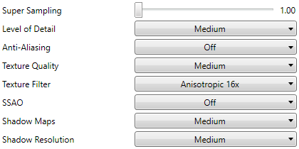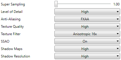 Настройки вертикальной синхронизации дисплея просты и в объяснении не нуждаются, VSync Interval позволяет ограничивать FPS не только полноценной частотой обновления (60 Гц в большинстве случаев), но и половинной — 60/2=30 FPS. При тестировании это никак не пригодится, поэтому отключаем синхронизацию вовсе. Далее идет настройка полноэкранного сглаживания методом суперсэмплинга, но она нас не интересует по причине крайней требовательности к производительности GPU — при максимальном значении 2.0 скорость рендеринга на GPU средней мощности падает с 56 FPS сразу до 24 FPS — более чем вдвое!