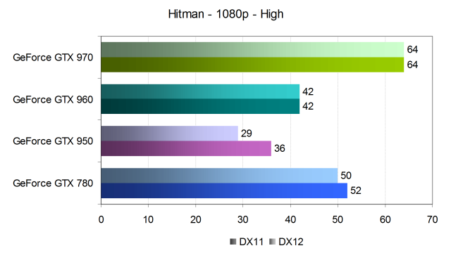 Даже GeForce GTX 780 еле справляется с игрой в таких условиях, да и то лишь при использовании DirectX 11. И только старшая модель GTX 970 показала почти 50 FPS в среднем, чего вполне хватит для игры в Hitman. Преимущества от перехода с DX11 на DX12-рендерер у всех видеокарт GeForce снова не наблюдается. Новая версия API обычно приносит преимущество из-за лучшей многопоточности и оптимизаций для условий ограничения общей производительности мощностью CPU, а в сложном режиме высоких настроек, скорость рендеринга упирается скорее в возможности GPU.