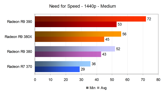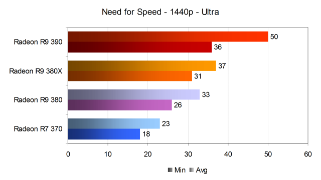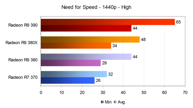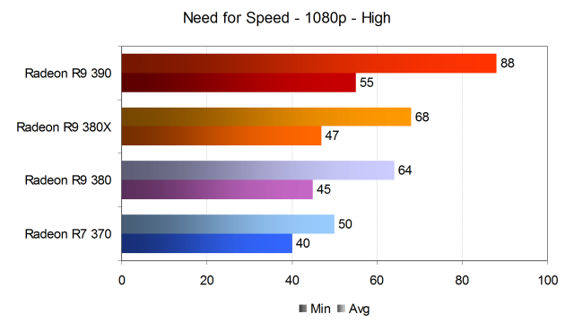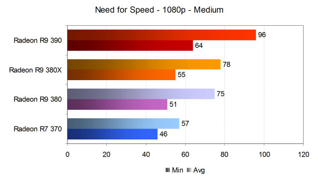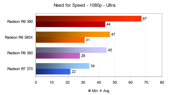 Самая слабая видеокарта нашего исследования в виде Radeon R7 370, даёт приемлемую частоту кадров в игре Need for Speed не только при средних настройках, но и высоких, хотя это справедливо только для более низкого Full HD-разрешения и при достаточности 30 кадров в секунду минимум. В более высоком разрешении Radeon R7 370 не смогла справиться даже со средними настройками качества, так что обладателям таких мониторов нужно использовать более мощные видеокарты — хотя бы Radeon R9 380(X).
