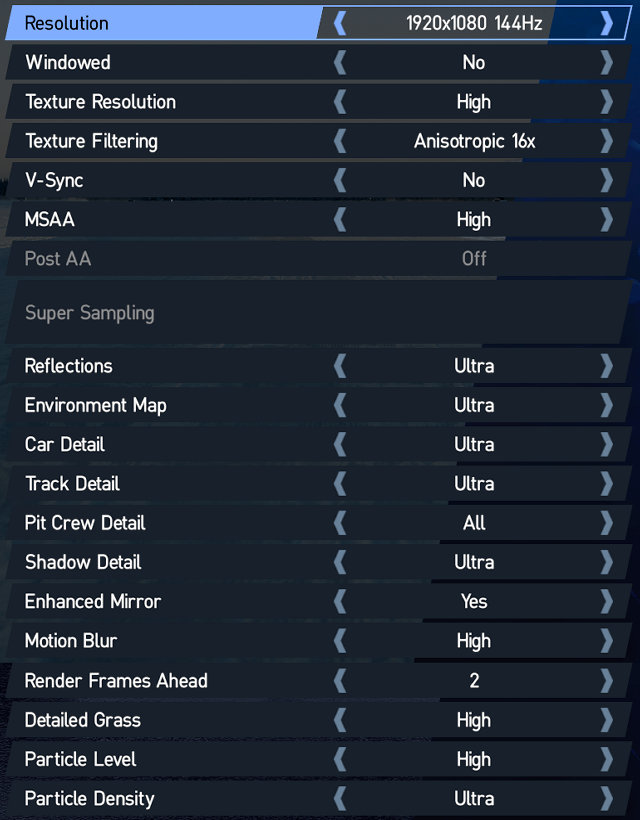 Игра предлагает несколько методов полноэкранного сглаживания: постобработка FXAA или SMAA, мультисэмплинг MSAA и суперсэмплинг SSAA, но ни один из них не работает одновременно быстро и хорошо. В игре многие объекты имеют резкие грани, которые нужно сгладить: автомобили, растения, здания, ограда, трибуны и т. п. И если геометрические грани еще сглаживаются с грехом пополам, то растительность сгладить удается разве что при помощи суперсэмплинга. У которого другая проблема — он очень медленный и смысл включать его есть разве что у владельцев топовых видеокарт, вроде GeForce GTX 1080 Ti.