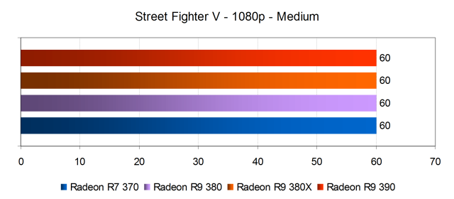 И тут изменений не слишком много — минимальная частота кадров 60 FPS обеспечивается всеми моделями Radeon, кроме самой слабой Radeon R7 370, которая в таких условиях иногда всё же теряет плавность и комфорт, что конкретно для Street Fighter V не подходит. Жанр требует молниеносной реакции и быстрых действий, и для файтинга с привязкой таймингов к FPS такая скорость смены кадров означает просадки производительности, хоть и не слишком частые.