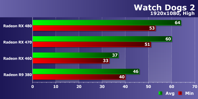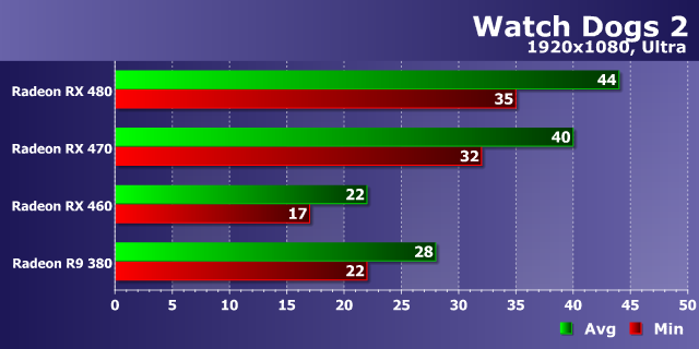Скорость рендеринга в случае установки максимально возможных графических настроек серьезно снизилась для всех четырех видеокарт. Производительность младшей Radeon RX 460 в таких условиях уже абсолютно точно не обеспечивает играбельности, средний показатель частоты кадров на этой видеокарте снизился до значения в 22 FPS, что попросту неиграбельно для Watch Dogs 2.