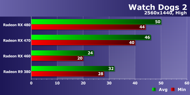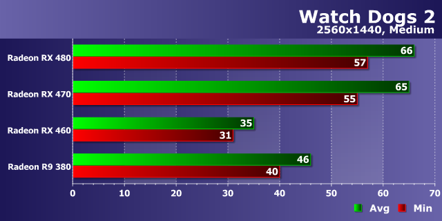 При установке более высокого разрешения рендеринга производительность старших видеокарт компании Sapphire в Watch Dogs 2 почти не снизилась, что подтверждает упор производительности в мощность CPU при условии мощных графических процессоров в Full HD. Младшая модель нынешнего поколения Radeon RX 460 в условиях WQHD-разрешения даже при средних настройках уже не смогла справиться с задачей обеспечения 40 FPS, показав 35 кадров в секунду, что нельзя считать играбельным по нашему опыту, учитывая хоть и тяжелую тестовую сцену, но явно не самую экстремальную. При такой скорости рендеринга изображение недостаточно быстро поспевает за действиями игрока, и играть будет неприятно. Придется снижать некоторые из настроек ниже среднего уровня.