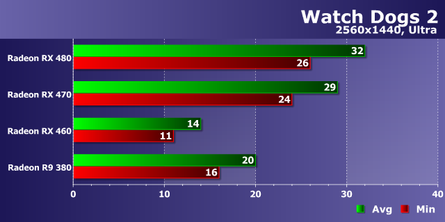 Увы, но при установке Ультра-профиля настроек качества в WQHD-разрешении, абсолютно все видеокарты Sapphire не смогли справиться с обеспечением минимально приемлемого комфорта и плавности. Ни одна из представленных в нашем сравнении Radeon не смогла показать 40 FPS, даже старшая Radeon RX 480 обеспечила лишь 32 FPS в среднем при 26 FPS минимальных, что далеко от комфорта в игре Watch Dogs 2. Что уж говорить о самых слабых решениях, которые скатились уже до натурального слайд-шоу в 14-20 FPS. И это еще не максимальные графические настройки!