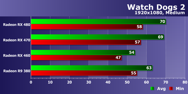 Остальные же видеокарты Radeon из нашего сравнения являются более мощными, и они в таких простых условиях способны дать в игре еще больший комфорт и плавную смену кадров на скорости 63-70 FPS в среднем (ограничено способностями CPU). Хотя на этой тройке видеокарт при средних настройках частота кадров все же изредка падала ниже 60 FPS, был достигнут комфорт, близкий к максимальному. И Radeon R9 380 и оба решения архитектуры Polaris обеспечили скорость, близкую к стабильным 60 FPS.