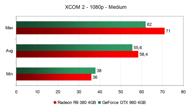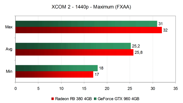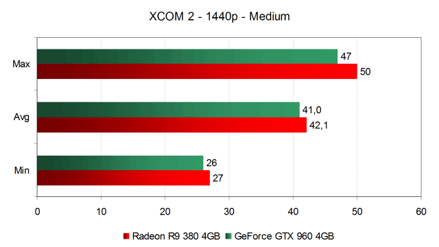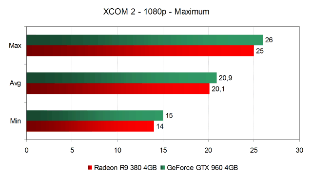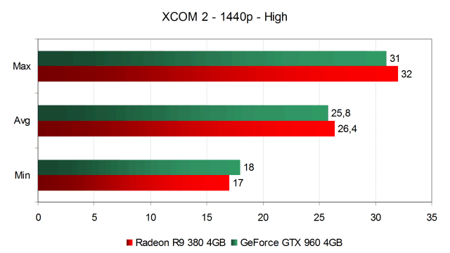 А вот при высоких настройках качества в 2560×1440 получилось уже хуже. И GeForce GTX 960, и Radeon R9 380 провалились еще ниже и выдают лишь около 26 FPS в среднем, что сложно назвать комфортной производительностью даже для пошаговой тактической игры XCom 2. Начиная с высоких настроек в разрешении 2560×1440 этот класс видеокарт можно называть играбельным весьма условно. С большой скидкой такую производительность можно назвать минимально допустимой для игры этого жанра, но в сценах с большим количеством персонажей и эффектов производительность может упасть ниже минимально комфортного уровня.