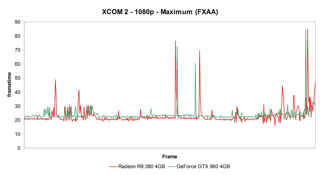 Этот график еще более наглядно указывает на разницу между плавностью смены кадров на системах с Radeon R9 380 и с GeForce GTX 960. В среднем Radeon даже чуть быстрее, чем GeForce, время отрисовки кадров этим решением ближе к 20 миллисекундам (в данном случае чем значения ниже — тем лучше).