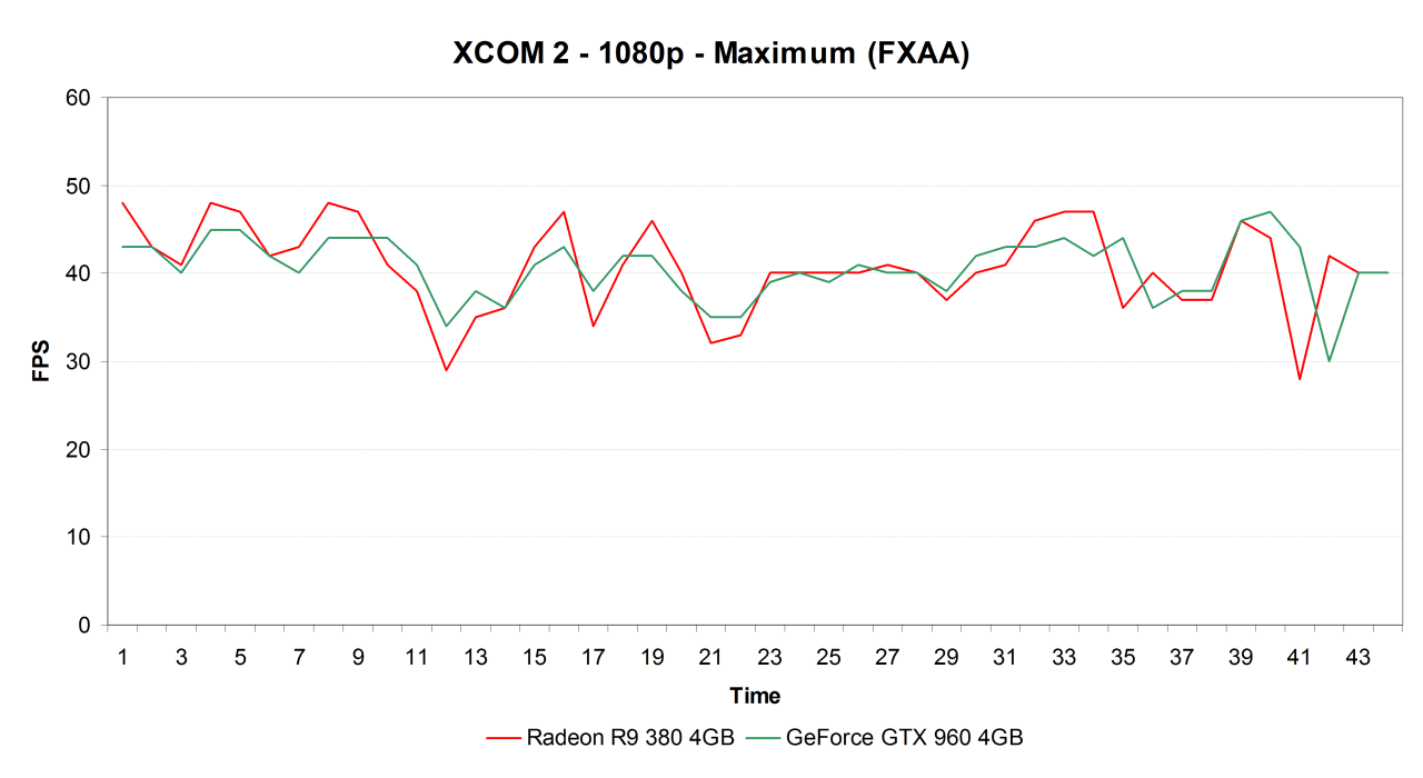 График FPS получился довольно наглядным: хотя в среднем Radeon и GeForce идут практически вровень, обеспечивая схожую производительность на протяжении всей сцены, но при этом хорошо видно, что частота кадров на Radeon R9 380 чаще прыгает туда-сюда, обеспечивая меньшие минимальные и бо́льшие максимальные значения FPS, что в теории должно приводить к чуть худшему комфорту при игре