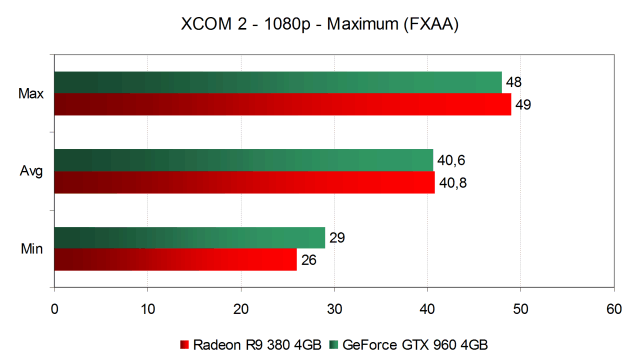 При отключении MSAA 8x производительность даже с максимальными настройками и на Radeon R9 380, и на GeForce GTX 960 близка к скорости в режиме High. Получается, что оптимальным режимом для Full HD-разрешения является именно такой вариант — профиль максимальных настроек, но с заменой MSAA на FXAA. Средняя частота кадров при этом превышает 40 FPS, а минимальная составляет 26-29 FPS, и GeForce тут снова слегка впереди.
