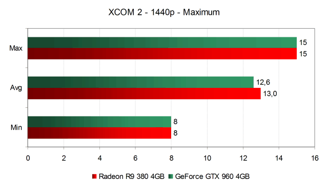 С учетом полученной производительности при меньшем разрешении, самые высокие настройки в WQHD можно было и не тестировать. Неудивительно, что мы получили очень низкую среднюю смену кадров порядка 13 FPS на обеих видеокартах — такая скорость рендеринга неспособна обеспечить комфорт при игре. Посмотрим, смогут ли Radeon R9 380 и GeForce GTX 960 «потянуть» режим максимальных настроек с отключенным мультисэмплингом.