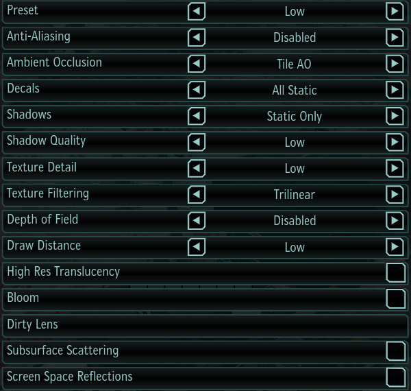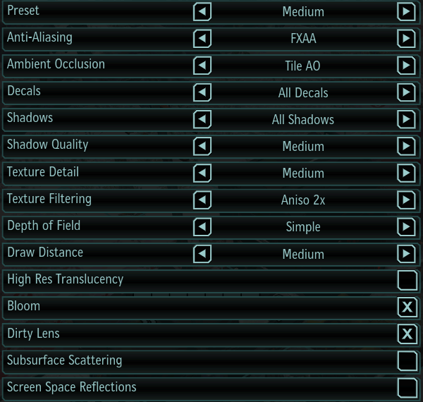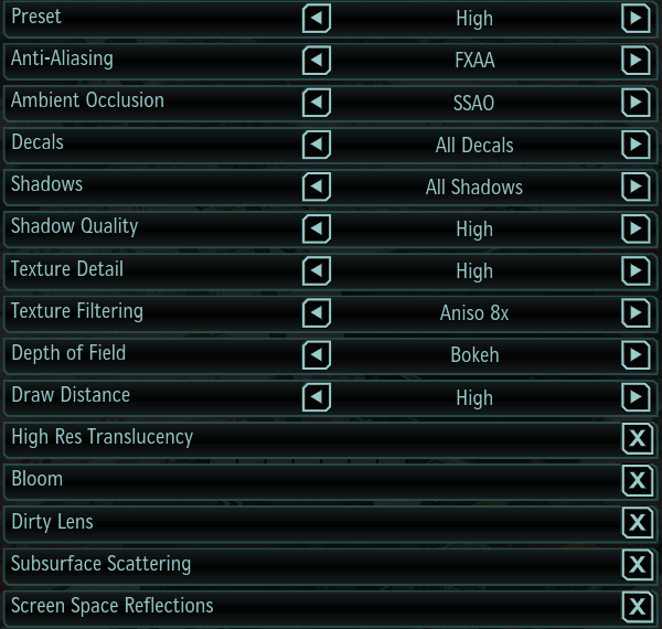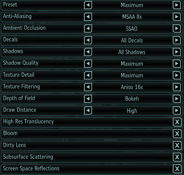 Остальные параметры вроде Bloom и Dirty Lens в основном отвечают за включение фильтров постобработки, используемых в некоторых сценах игры. Чаще всего их включение весьма слабо сказывается на общей производительности при наличии современных графических процессоров хотя бы среднего уровня, поэтому можно рекомендовать оставить их включенными, так как они привносят некоторую долю реалистичности картинки, что особенно заметно в роликах на движке игры. То же относится и к Subsurface Scattering — эффекту подповерхностного рассеивания, который служит для более реалистичного рендеринга кожи персонажей.
