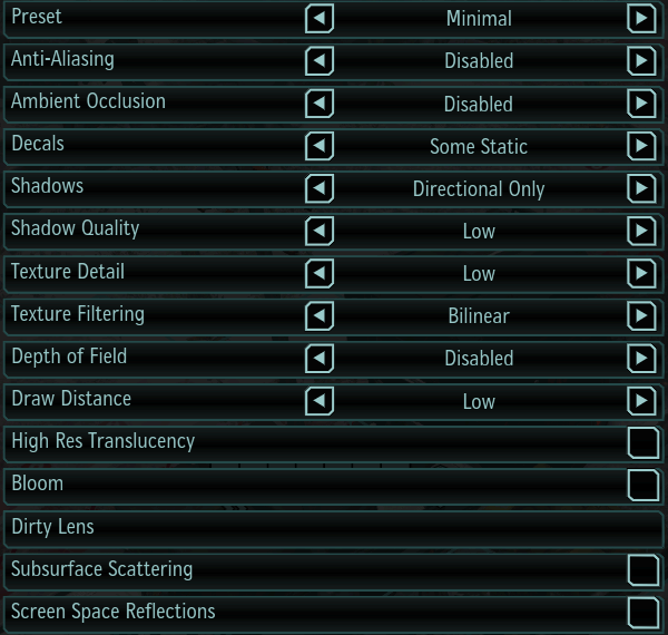 Тут можно сразу применить один из предустановленных профилей настроек: Minimum, Low, Medium, High и Maximum, которые влияют на все остальные параметры качества. Но не обязательно ограничиваться фиксированными профилями, можно настроить качество под свои нужды. Вот все предустановленные в игре профили: