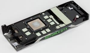 Неудивительно, что GeForce GTX 1070 Ti Founders Edition оснащена все тем же кулером с медной испарительной камерой, что мы видели в стандартной плате GTX 1080. Аналогичный кулер ранее использовался для охлаждения графических процессоров с потреблением в 250 Вт, и GeForce GTX 1070 Ti Founders Edition с потреблением в 180 Вт явно имеет немалый запас по эффективности охлаждения, что также позволит энтузиастам поднять турбо-частоту GPU и предел потребления энергии, обеспечив заметный прирост в итоговой 3D-производительности.