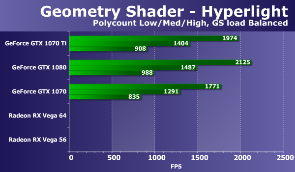 При изменении нагрузки цифры в этом тесте изменились незначительно, и для плат AMD и для решений Nvidia. Видеокарты в этом тесте геометрических шейдеров слабо реагируют на изменение параметра GS load, отвечающего за перенос части вычислений в геометрический шейдер, поэтому и наши выводы остаются неизменными. GeForce GTX 1070 Ti и в этом подтесте показала сильный результат, обогнав конкурентов от AMD в тяжелых и средних условиях, и почти не отстав от GeForce GTX 1080, что соответствует теории.