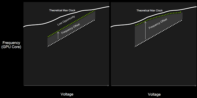 Слева указан GPU Boost второй версии, справа — третьей, появившейся в Pascal. Фиксированная разница между базовой и турбо-частотами не давала раскрыть возможности GPU полностью, в некоторых случаях графические процессоры предыдущих поколений могли работать быстрее на установленном напряжении, но фиксированное превышение турбо-частоты не давало сделать этого. В GPU Boost 3.0 такая возможность появилась, и турбо-частота может устанавливаться для каждого из индивидуальных значений напряжения, полностью выжимая все соки из GPU.