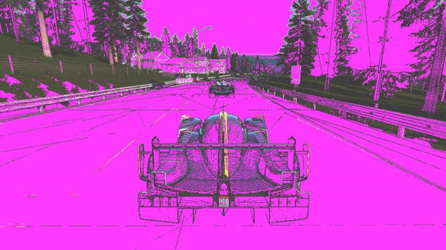 Впрочем, в реальности последнее бывает весьма нечасто. В этом можно убедиться по примерам скриншотов из игры Project CARS, которые привела Nvidia чтобы проиллюстрировать повышенную степень сжатия в Pascal. На иллюстрациях пурпурным закрашены те тайлы кадрового буфера, которые смог сжать графический процессор, а не поддающиеся сжатию без потерь остались с оригинальным цветом (сверху — Maxwell, снизу — Pascal).
