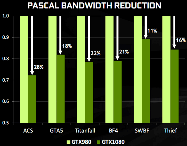 Графический процессор GP104 в составе GeForce GTX 1080 поддерживает большее количество алгоритмов сжатия по сравнению с предыдущими чипами архитектуры Maxwell. Так, алгоритм сжатия 2:1 стал более эффективным, а в дополнение к нему появились два новых алгоритма: режим сжатия 4:1, подходящий для случаев, когда разница в значении цвета пикселей блока очень невелика, и режим 8:1, сочетающий алгоритм постоянного сжатия с соотношением 4:1 блоков размером 2×2 пикселя с двукратным сжатием дельты между блоками. Когда сжатие совсем невозможно, оно не используется.