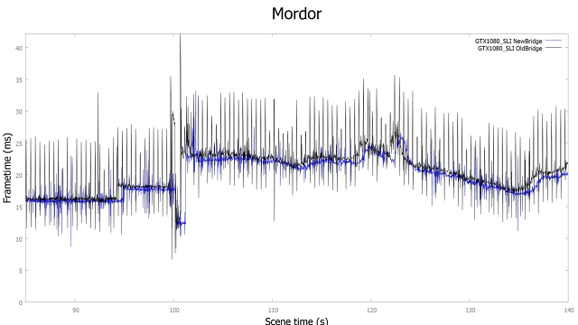 Также, при использовании мостиков SLI HB, интерфейс передачи данных GeForce GTX 1080 работает на скорости 650 МГц, по сравнению с 400 МГц у обычных мостиков SLI на старых GPU. Причем, для некоторых из жестких старых мостиков также доступна более высокая частота передачи данных с видеочипами архитектуры Pascal. С ростом скорости передачи данных между GPU по удвоенному интерфейсу SLI с повышенной частотой работы, обеспечивается и более плавный вывод кадров на экран, по сравнению с предыдущими решениями: