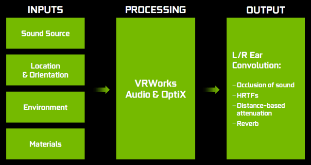 В пакете VRWorks Audio используется просчет звуковых волн аналогично трассировке лучей при рендеринге, когда путь лучей света отслеживается до нескольких отражений от объектов в виртуальной сцене. VRWorks Audio также имитирует распространение звуковых волн в окружающей среде, когда отслеживаются прямые и отраженные волны, в зависимости от угла их падения и свойств отражающих материалов. В своей работе VRWorks Audio использует известный по графическим задачам высокопроизводительный движок Nvidia OptiX, предназначенный для трассировки лучей. OptiX может использоваться для разнообразных задач, таких как расчет непрямого освещения и подготовка карт освещения, а теперь и для трассировки звуковых волн в VRWorks Audio.