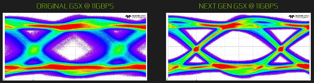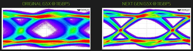 Несмотря на то, что ширина шины памяти у GP102 и так достаточно велика, для улучшения производительности в Nvidia решили поставить на GeForce GTX 1080 Ti самую быструю GDDR5X-память, какая только доступна. Такое решение далось не так уж легко, инженерам компании пришлось работать с партнерами, производящими микросхемы памяти, для дальнейшего совершенствования GDDR5X. Если старые микросхемы памяти, известные по GTX 1080, заставить работать на эффективной частоте 11 ГГц, то качество сигналов будет очень низким, поэтому потребовались технологические улучшения: оптимизация каналов, минимизация шумов и джиттера и т. д.