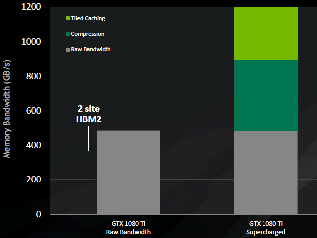 Конечно, сжатие данных и прибавка производительности от тайлового кэширования будут отличаться от игры к игре, но в целом добавка в эффективной ПСП составляет примерно два раза. И даже если не учитывать «виртуальный» рост ПСП, то реальная пропускная способность памяти GeForce GTX 1080 Ti не сильно отстает от производительности двухстековой HBM2-памяти, которую можно было бы ожидать от топовых решений в 2017 году (512 ГБ/с).