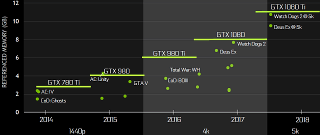 Конечно, специалисты компании немного лукавят, приводя данные для 4К- и 5К-разрешений для двух самых современных видеокарт, но ведь и правда — если в 2016 году GeForce GTX 980 Ti хватало 6 ГБ локальной видеопамяти, то GTX 1080 вполне смогла получить преимущество от имеющегося объема в 8 ГБ, ну а если идти дальше, и измерить потребление VRAM в таких играх, как Watch Dogs 2 и Deus Ex: Mankind Divided в 5К-разрешении, то... лучше иметь более чем 10 ГБ памяти. И для запаса на будущее полезно. Забавно, что в Nvidia решили урезать возможности GPU до 11 ГБ, но нужно же оставить для Titan X хоть какое-то преимущество.
