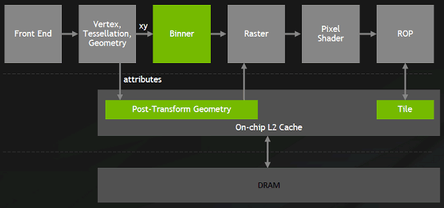 В графических процессорах архитектур Pascal и Maxwell используется иной подход, хотя и использующий разбиение на тайлы, но это все та же традиционная модель, без предварительного геометрического прохода. Но вместе с этим используется и специальный блок binner, который записывает в кэш геометрические данные. По мере заполнения буфера сохраненными данными, GPU отрисовывает эту геометрию тайл за тайлом. Основное преимущество нового подхода в том, что геометрические данные и пиксели при рендеринге тайла целиком хранятся в начиповом L2-кэше и используется его когерентность, что позволяет снизить нагрузку на внешнюю память, экономя ПСП.