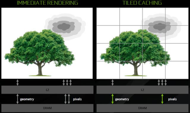 Кроме этого, во всех графических процессорах Nvidia, начиная с Maxwell, применяется тайловое кэширование (Tiled Caching). Это не совсем тот тайловый рендеринг, который известен нам по многим мобильным GPU, но в графических процессорах компании используется схожий подход для экономии пропускной способности памяти, когда рендеринг осуществляется небольшими участками экранного буфера (тайлами).