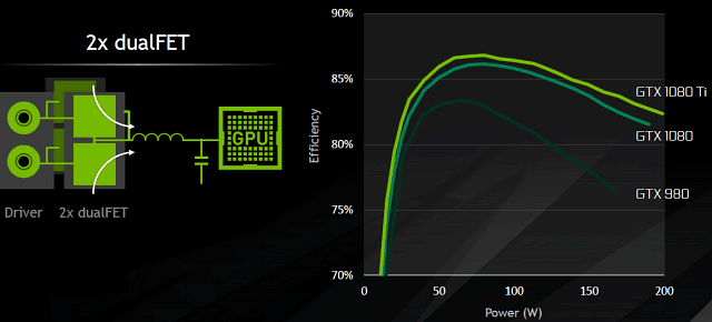 По сравнению с GeForce GTX 1080 Founders Edition, была серьезно модифицирована и система питания новой модели. Уже предыдущие решения серии GeForce GTX 10 имели dualFET-транзисторы на GPU и памяти, что улучшило энергоэффективность и надежность, а также возможности разгона. Но в случае GeForce GTX 1080 Ti Founders Edition разработчики пошли дальше, установив 7-фазную систему питания с двойными dualFET-транзисторами, способную обеспечить ток в 250 А для GPU.