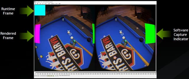 Снимать реальные данные с видеовыхода не так то просто, приходится использовать HDMI-сплиттер и карту видеозахвата. Не говоря уже о сложном процессе анализа снятых данных. Для решения этого компания Nvidia анонсировала новую утилиту FCAT VR, и вставляет в кадр специальные цветовые индикаторы, позволяющие понять, какие кадры были отрисованы в каждый момент времени, и затем анализирует выходной видеопоток аналогично FCAT, только уже специализированно для виртуальной реальности.