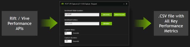 Но теперь есть и более простой вариант — в FCAT VR есть возможность исключительно программного метода анализа производительности, аналогично Fraps, но специализированного именно для виртуальной реальности, и имеющего большую точность. FCAT VR использует специальные API производителей VR-шлемов (HTC Vive и Oculus Rift) и выводит в CSV-файлы все необходимые данные о производительности приложений виртуальной реальности, что гораздо удобнее использования громоздкой схемы с видеозахватом.