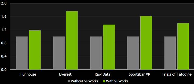 В обзоре топовой видеокарты нельзя не упомянуть и тему виртуальной реальности, продвижение в массы которой хоть и изрядно буксует, но все же потихоньку происходит. Компания Nvidia продолжает сотрудничество с разработчиками программного и аппаратного обеспечения в сфере VR для того, чтобы пользователи смогли насладиться виртуальной реальностью в полной мере. Основной проблемой VR, не связанной с физическими ограничениями (провода, большой шлем на голове, ...) является недостаток производительности, ведь VR требует более чем вдвое увеличенной мощности GPU, по сравнению с обычным рендерингом. И Nvidia старается снизить нагрузку на графические процессоры при помощи сразу нескольких технологий.