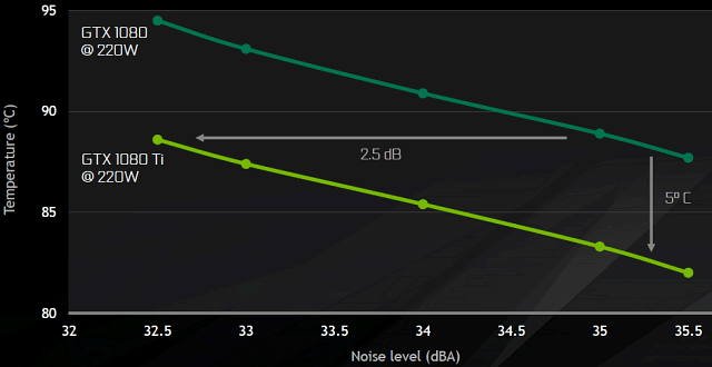 В итоге, референсная плата GeForce GTX 1080 Ti имеет следующий набор разъемов для присоединения устройств вывода изображения: один HDMI и три DisplayPort. По заявлению Nvidia, улучшенный по сравнению с GTX 1080 кулер позволяет получить или на 2,5 дБ меньший уровень шума при одинаковой температуре на GPU, или снизить температуру графического процессора на 5 градусов при сохранении одинакового уровня шума от кулера — неплохой результат.