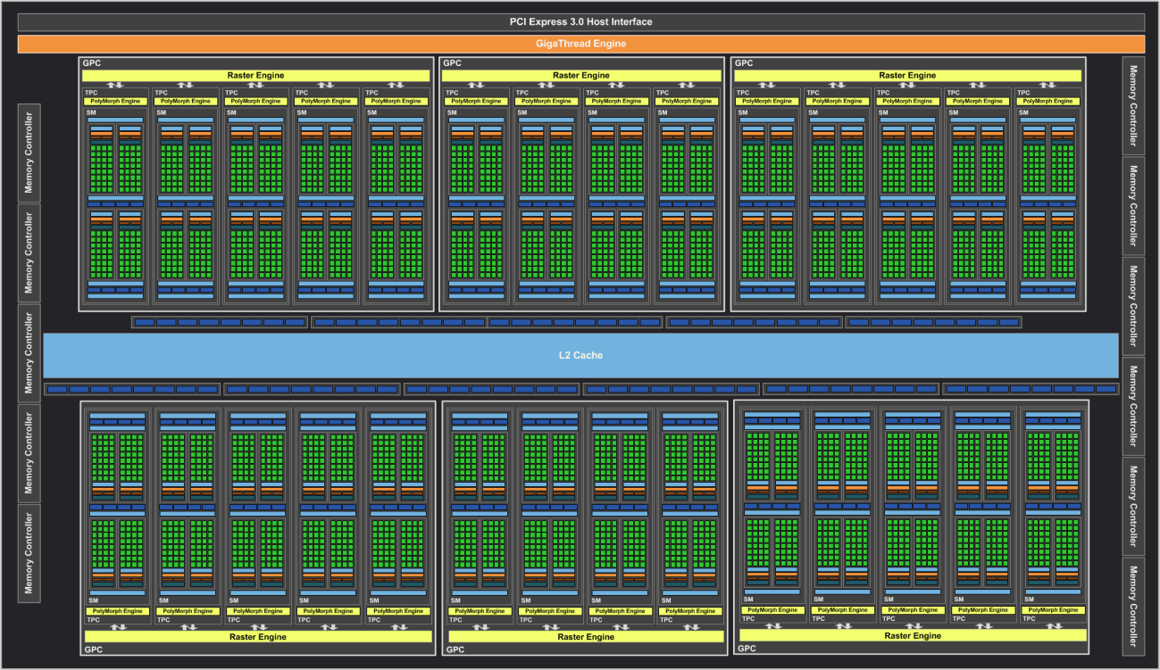 Как и GPU предыдущего поколения, процессоры архитектуры Pascal имеют разную конфигурацию вычислительных кластеров Graphics Processing Cluster (GPC), потоковых мультипроцессоров Streaming Multiprocessor (SM) и контроллеров памяти, спаренных с блоками растеризации ROP. Мультипроцессор SM — это высокопараллельный мультипроцессор, который управляет исполнением и запускает варпы (группы из нескольких потоков команд) на CUDA-ядрах и других исполнительных блоках мультипроцессора. Подробнее об устройстве всех этих блоков и GPU целиком мы писали в обзорах предыдущих решений компании.