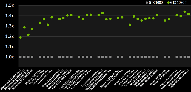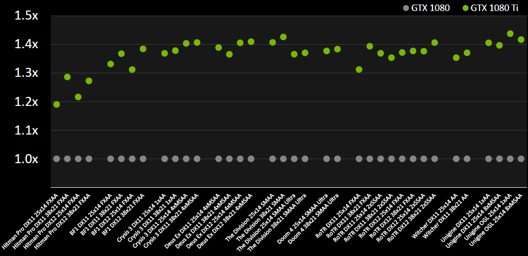 35% получили в самой Nvidia, протестировав GeForce GTX 1080 и GTX 1080 Ti в девяти приложениях (восьми играх и бенчмарке Unigine) при различных настройках и разрешениях от 2560×1440 до 4К. Интересно, что наименьшая разница была отмечена в игре Hitman — даже при условии установки 4К-разрешения, производительность и современных игр зачастую упирается в CPU, что не позволяет раскрыться столь мощному графическому процессору.