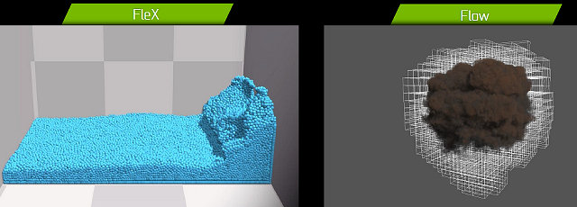 Эти технологии GameWorks применяются в играх для физических симуляций, которые ранее приходилось предрассчитывать заранее, а теперь это доступно в реальном времени при использовании GPU. FleX — техника симуляции на основе систем частиц для визуальных эффектов реального времени. До появления FleX разработчикам приходилось использовать несколько отдельных специализированных солверов: для физики твердых тел, жидкостей и тканей, FleX же использует унифицированный подход для всех объектов при помощи частиц, позволяя разным объектам взаимодействовать друг с другом, и чаще всего применяется для реалистичного воссоздания жидкостей, огня и дыма.