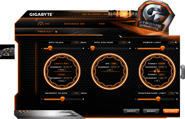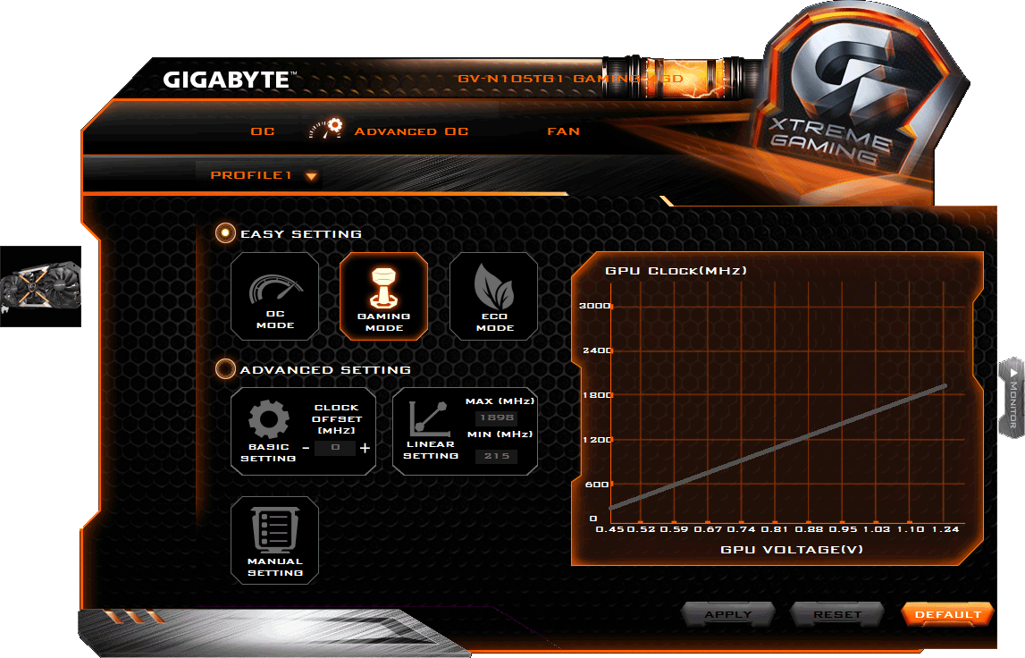 Программа позволяет выбрать один из предустановленных режимов работы ускорителя в 3D: OC или Gaming (различия между ними заключаются лишь в частотах работы). Можно создать свой собственный профиль, выбрав частоты и вольтажи. Утилита также позволяет выставить режим подсветки кулера, управлять кулером вручную.
