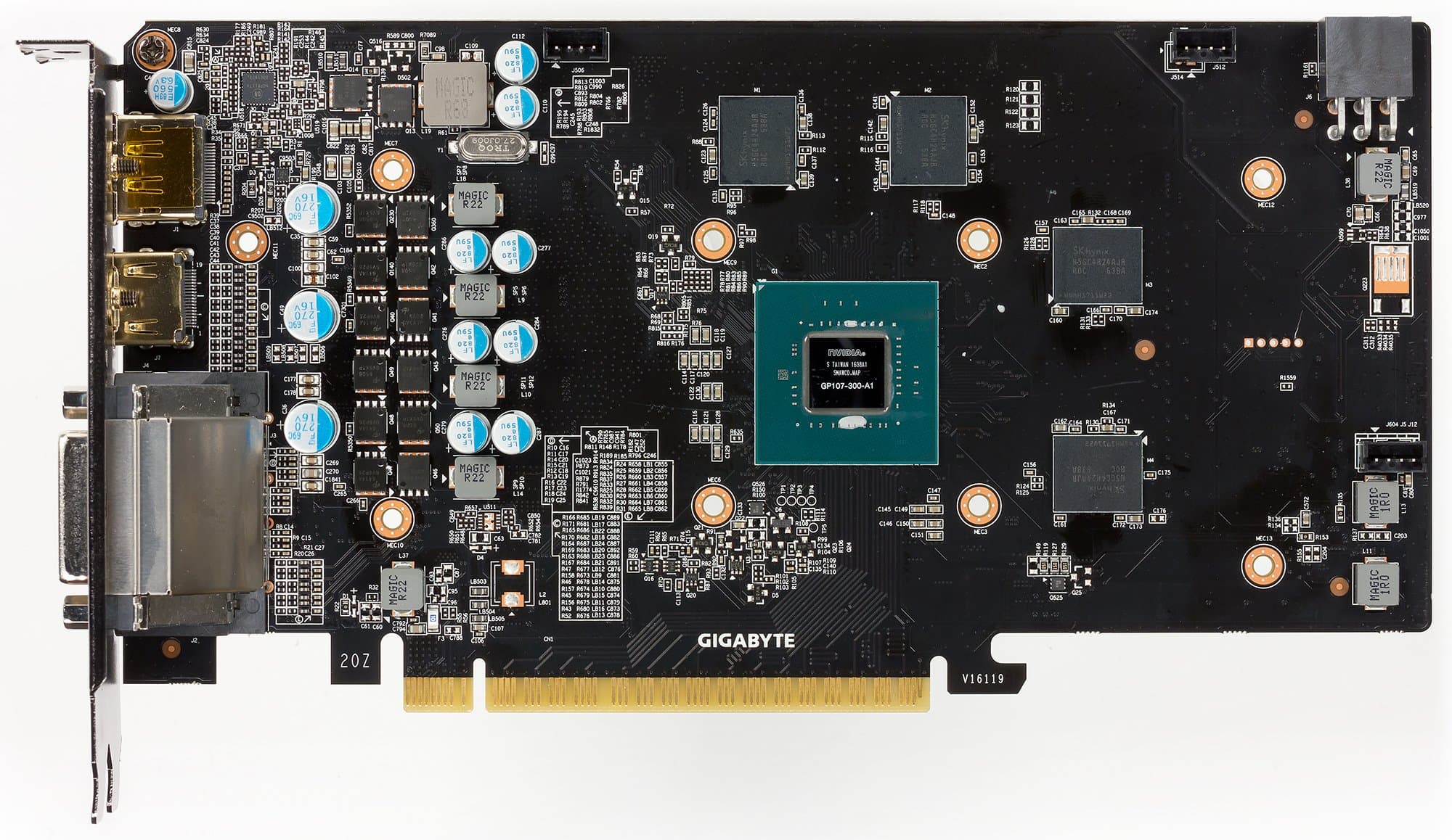 Карта имеет 2 ГБ памяти GDDR5 SDRAM, размещенной в 4 микросхемах по 4 Гбит на лицевой стороне PCB. Микросхемы памяти SK Hynix (GDDR5). Микросхемы рассчитаны на номинальную частоту работы в 1750 (7000) МГц. | ![]() |
