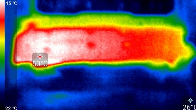 На тыльной стороне платы — пластина, мешающая локализовать максимально нагретую область, на ее внешнем крае максимальный нагрев около 57 °C.