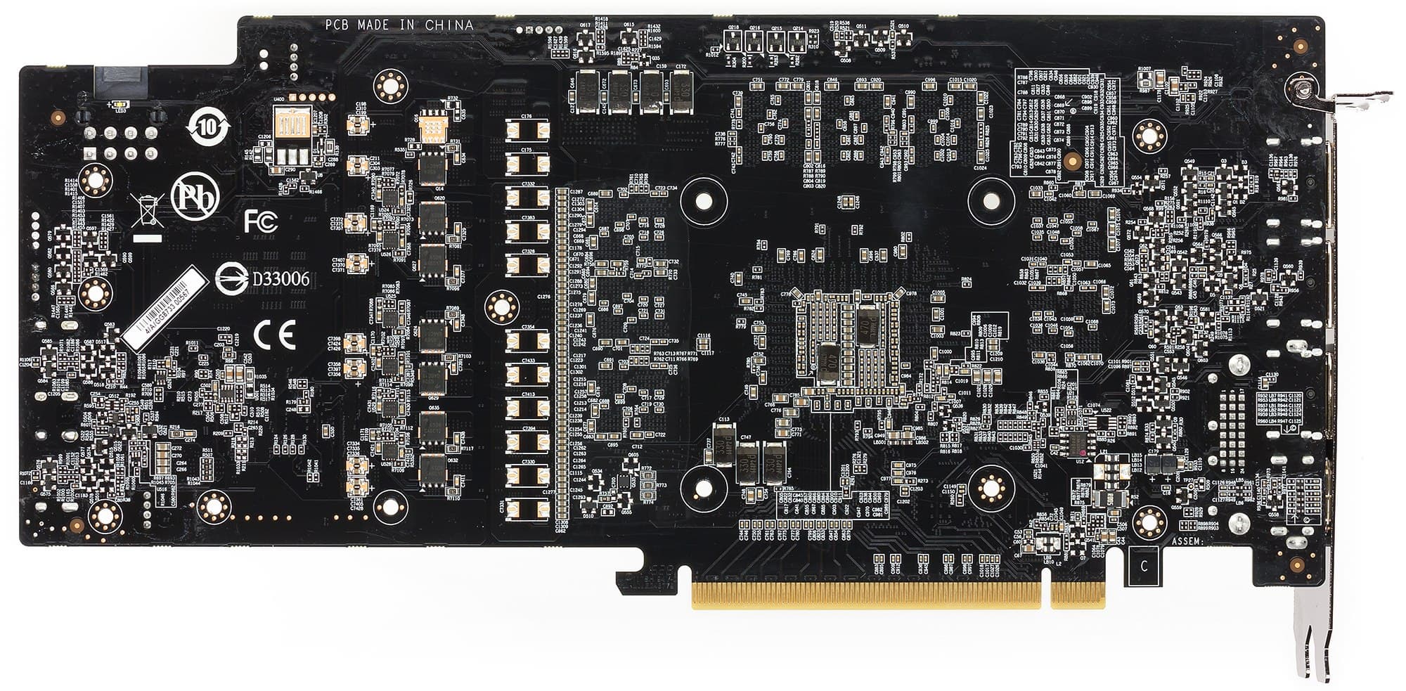 Система питания имеет 7 фаз (6 для GPU и 1 для памяти), что дает возможность регулировать вольтажи с очень малым шагом для достижения максимального разгона при сохранении стабильной работоспособности и защите элементов от перегорания. Преобразователь питания управляется цифровым контроллером uP9511P производства uPI Semiconductor. Ускоритель поддерживает функцию мониторинга, за которую отвечает контроллер Holtek HT32F52241 на базе микроконтроллера ARM Cortex -M0+. Стоит упомянуть и технологию производства PCB — Ultra Durable, которая подразумевает двойные медные слои в текстолите и набор высококачественных дросселей и твердотельных конденсаторов. Все это снижает нагрев карты, а также может повысить шанс отсутствия свиста катушек при работе ускорителя.