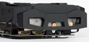 Теперь насчет готовности к VR. Надо заметить, что основной набор видеовыходов здесь стандартен, однако в хвостовой части карты можно увидеть 2 дополнительные выхода HDMI. К ним подключаются кабели устройств VR (виртуальной реальности), поэтому данный ускоритель полностью готов для работы совместно с очками VR (а его производительность вполне достаточна для такой работы).
