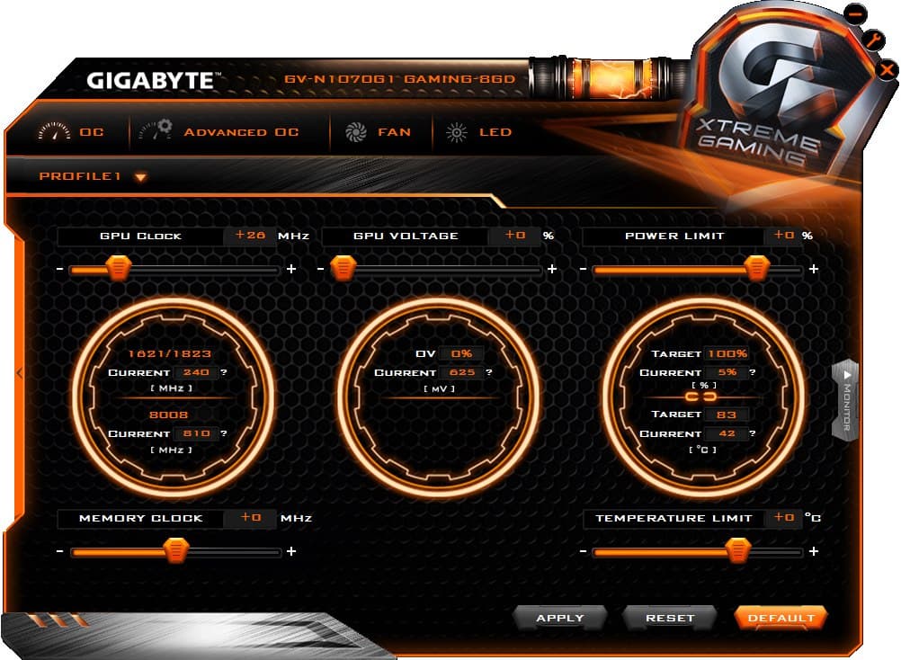 Gigabyte GeForce GTX 1070 G1 Gaming (8 ГБ) — очень хороший вариант 3D-акселератора, входящего в семейство топовых ускорителей. Этот продукт демонстрирует производительность в среднем на 10% выше, чем референс-карта. Ускоритель обладает очень тихой системой охлаждения, при этом нагрев даже под сильной нагрузкой остается небольшим. Имеются бонусы в виде возможности гибкого регулирования частот и режимов работы, так что карта отлично подойдет «оверклокерам средней руки», довольствующимся повышением частот при штатной СО. По поводу дополнительного ручного разгона: мы полагаем, что такие изыскания интересны лишь очень малому проценту пользователей, так что детального изучения вопроса не проводили. Мы изучим этот вопрос при тестировании Gigabyte GTX 1070 Xtreme Gaming, потому что та видеокарта официально входит в серию для оверклокеров. Стоит заметить, что любителям моддинга данный продукт понравится гибко регулируемой подсветкой на корпусе кулера. Акселератор полностью готов для работы совместно с устройствами VR.