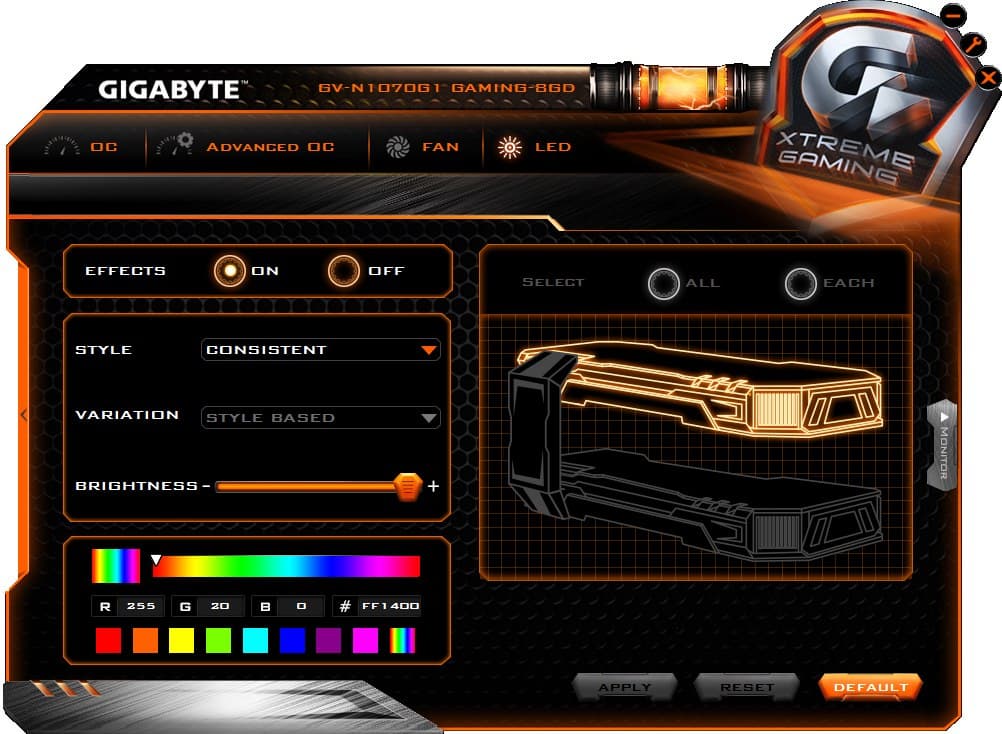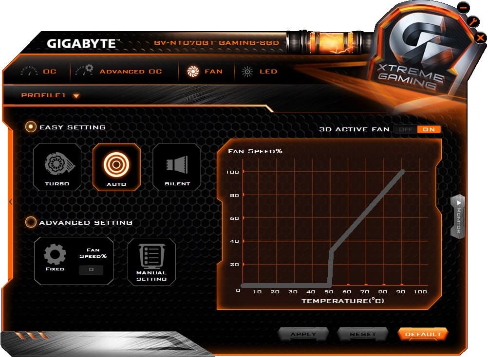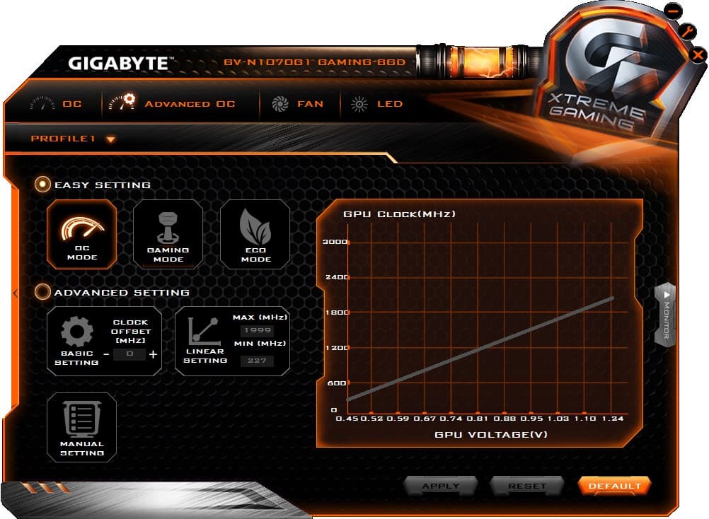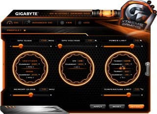 Программа позволяет выбрать один из уже предустановленных режимов работы ускорителя в 3D: OC, Gaming, Eco. Различия лишь в частотах работы. Либо можно создать свой собственный профиль режима работы, установив частоты и вольтажи. Утилита также позволяет выставить режим подсветки кулера, управлять кулером вручную.