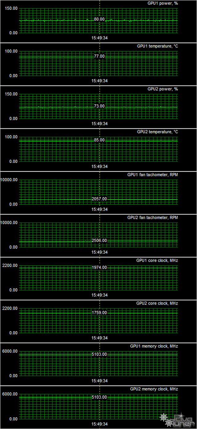 В режиме максимальной нагрузки в 3D температура достигала 77 °C у первого ускорителя (установленного выше в вертикальном корпусе) и 85 °C у второго. Вентиляторы при этом раскручивались до 2057/2506 оборотов в минуту, шум вырастал до 33,5 дБА, становился хорошо заметным, но все же не превышал эргономического предела.