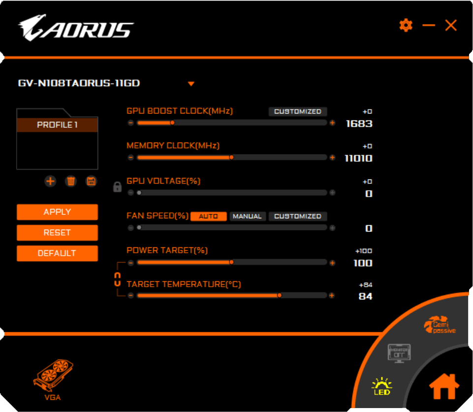 Aorus GeForce GTX 1080 Ti 11G (11 ГБ) на момент написания материала является одним из лучших вариантов топового однопроцессорного ускорителя, имея производительность в среднем на 4,7% выше, чем референсный GTX 1080 Ti. У карты довольно тихая система охлаждения, есть подсветка на кулере для любителей моддинга. Этот ускоритель отлично подойдет любителям разгона, позволяя гибко и максимально эффективно регулировать частоты и напряжения. Aorus GeForce GTX 1080 Ti 11G полностью готов для работы совместно с устройствами VR. Наши исследования с разгоном показали, что вполне достижимы частоты работы ядра 1650—2100 МГц, при этом ускоритель демонстрирует прирост производительности в среднем на 10% относительно референс-карты. Впрочем, и без дополнительного разгона это самый быстрый акселератор на сегодня, и его штатной производительности более чем хватает для всех современных игр даже в разрешениях уровня 4K (хотя такие мониторы все еще мало распространены).